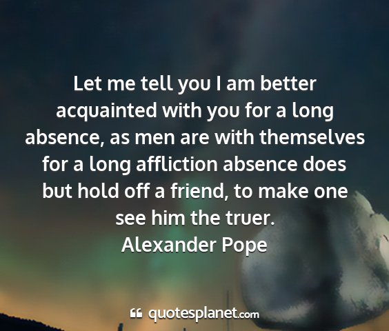 Let me tell you I am better acquainted with you for a long absence, as men are with themselves for a long affliction absence does but hold off a friend, to make one see him the truer.Alexander Pope