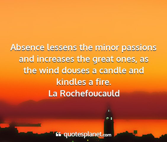 Absence lessens the minor passions and increases the great ones, as the wind douses a candle and kindles a fire.La Rochefoucauld