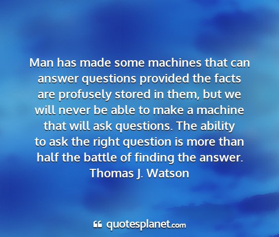 Man has made some machines that can answer questions provided the facts are profusely stored in them, but we will never be able to make a machine that will ask questions. The ability to ask the right question is more than half the battle of finding the answer.Thomas J. Watson