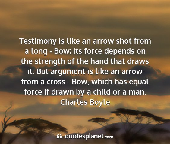 Testimony is like an arrow shot from a long - Bow; its force depends on the strength of the hand that draws it. But argument is like an arrow from a cross - Bow, which has equal force if drawn by a child or a man.Charles Boyle