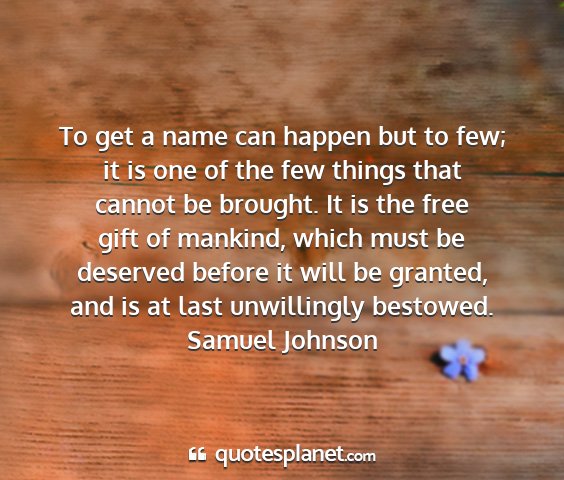 To get a name can happen but to few; it is one of the few things that cannot be brought. It is the free gift of mankind, which must be deserved before it will be granted, and is at last unwillingly bestowed.Samuel Johnson