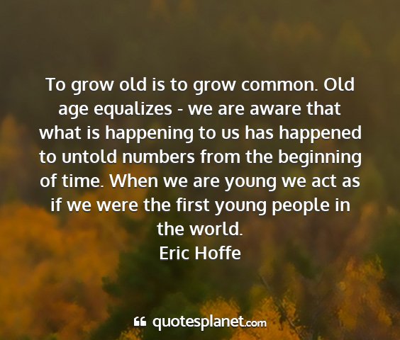 To grow old is to grow common. Old age equalizes - we are aware that what is happening to us has happened to untold numbers from the beginning of time. When we are young we act as if we were the first young people in the world.Eric Hoffe