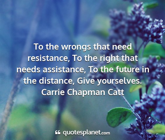 To the wrongs that need resistance, To the right that needs assistance, To the future in the distance, Give yourselves.Carrie Chapman Catt