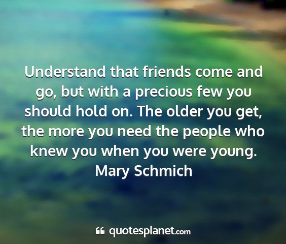 Understand that friends come and go, but with a precious few you should hold on. The older you get, the more you need the people who knew you when you were young.Mary Schmich