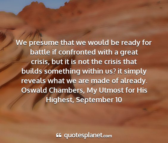 We presume that we would be ready for battle if confronted with a great crisis, but it is not the crisis that builds something within us? it simply reveals what we are made of already.Oswald Chambers, My Utmost for His Highest, September 10