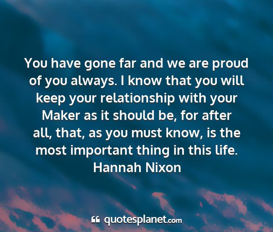 You have gone far and we are proud of you always. I know that you will keep your relationship with your Maker as it should be, for after all, that, as you must know, is the most important thing in this life.Hannah Nixon