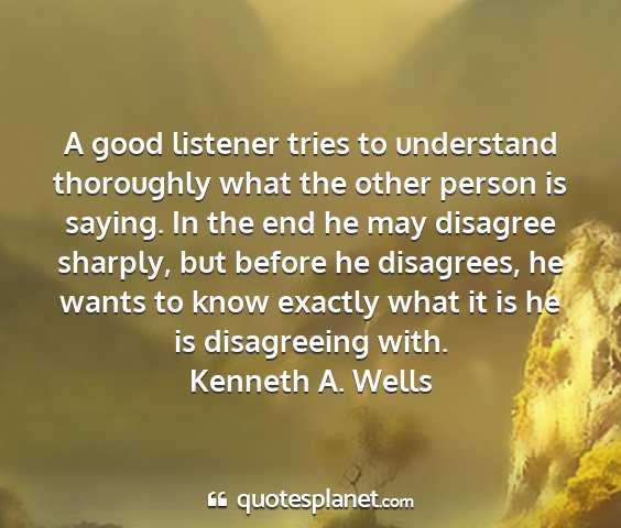 A good listener tries to understand thoroughly what the other person is saying. In the end he may disagree sharply, but before he disagrees, he wants to know exactly what it is he is disagreeing with.Kenneth A. Wells