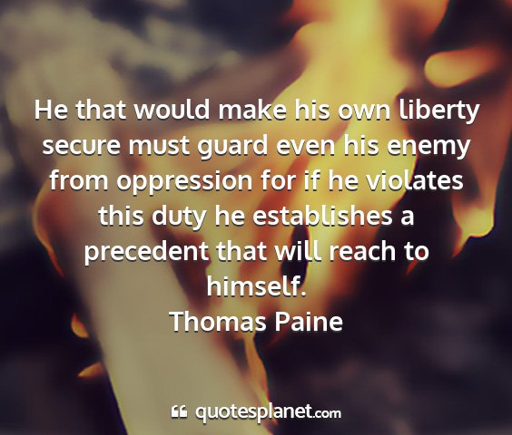 He that would make his own liberty secure must guard even his enemy from oppression for if he violates this duty he establishes a precedent that will reach to himself.Thomas Paine