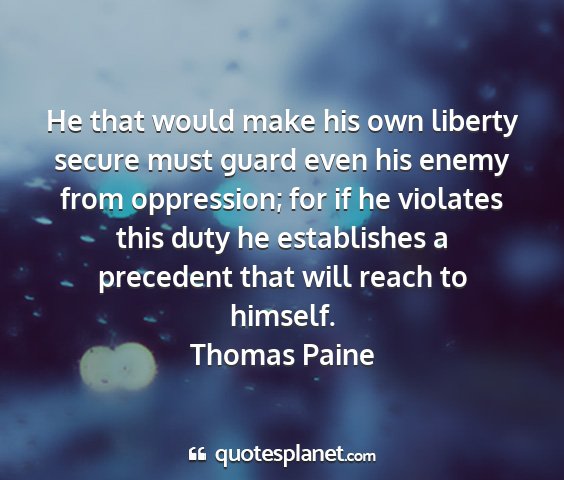 He that would make his own liberty secure must guard even his enemy from oppression; for if he violates this duty he establishes a precedent that will reach to himself.Thomas Paine