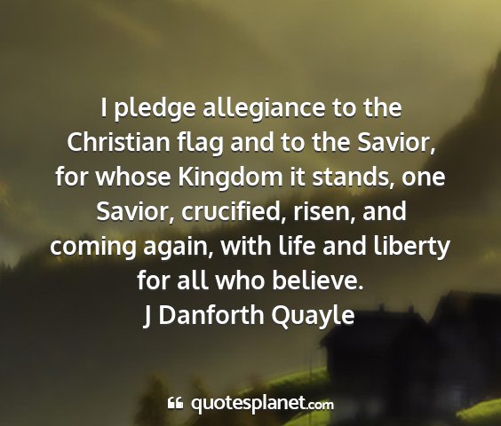 I pledge allegiance to the Christian flag and to the Savior, for whose Kingdom it stands, one Savior, crucified, risen, and coming again, with life and liberty for all who believe.J Danforth Quayle