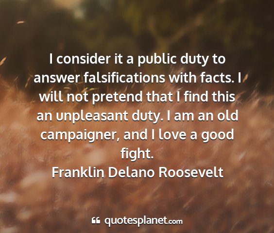 I consider it a public duty to answer falsifications with facts. I will not pretend that I find this an unpleasant duty. I am an old campaigner, and I love a good fight.Franklin Delano Roosevelt
