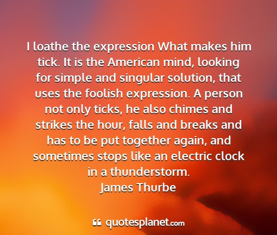 I loathe the expression What makes him tick. It is the American mind, looking for simple and singular solution, that uses the foolish expression. A person not only ticks, he also chimes and strikes the hour, falls and breaks and has to be put together again, and sometimes stops like an electric clock in a thunderstorm.James Thurbe