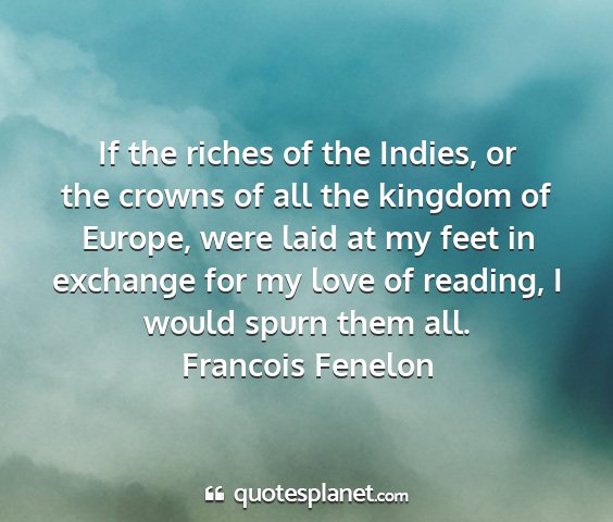 If the riches of the Indies, or the crowns of all the kingdom of Europe, were laid at my feet in exchange for my love of reading, I would spurn them all.Francois Fenelon